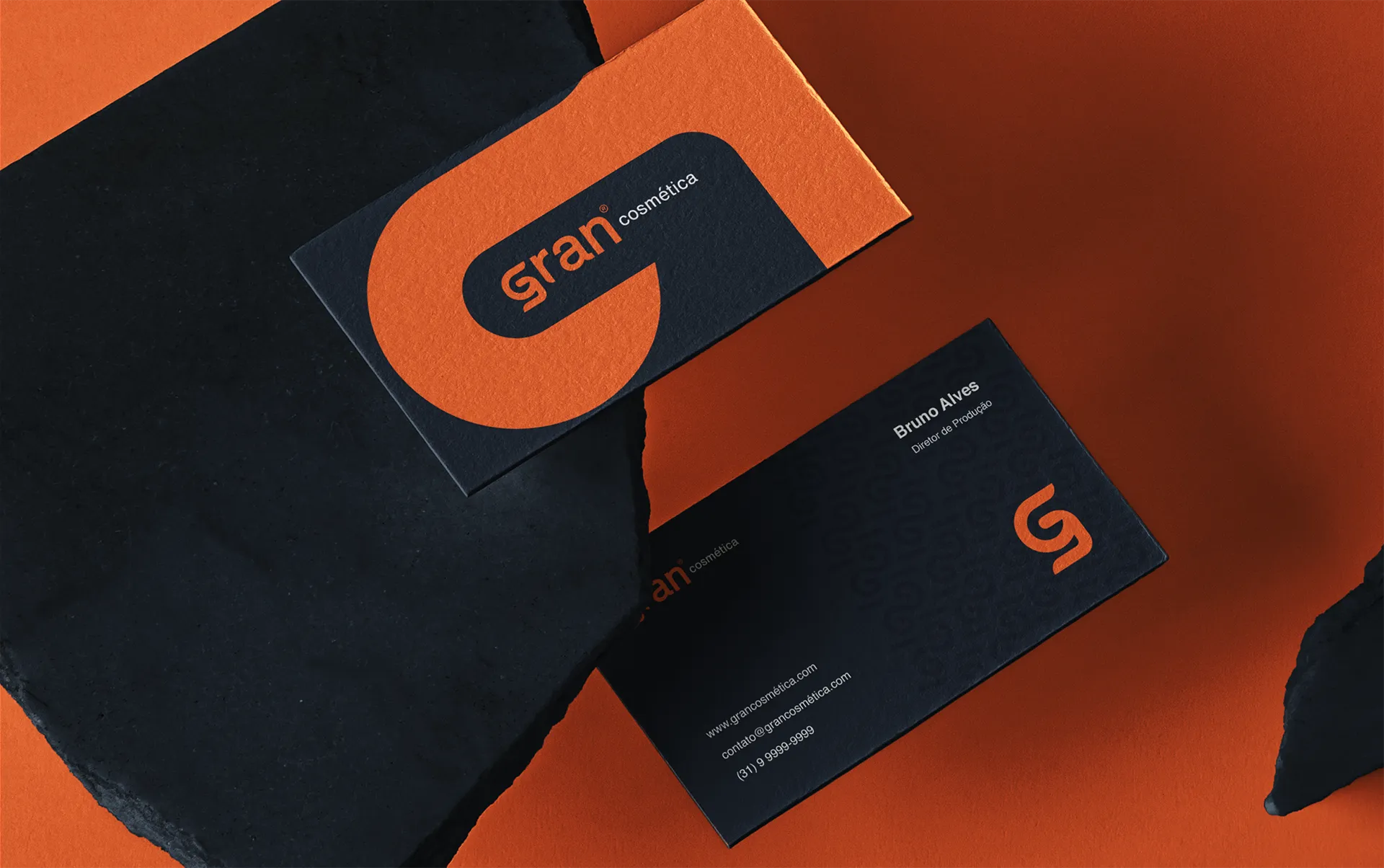 A paleta foi definida com intenção estratégica. O laranja vibrante (HEX FF6131) foi escolhido como cor principal por representar energia, vitalidade e o frescor dos produtos de beleza, enquanto o cinza escuro (HEX 1F2225) confere sofisticação e elegância ao conjunto. A combinação dessas duas cores cria um contraste marcante que inspira confiança e modernidade, posicionando a Gran Cosmética como uma marca que entrega qualidade premium sem perder a acessibilidade e o dinamismo que o público do segmento espera.