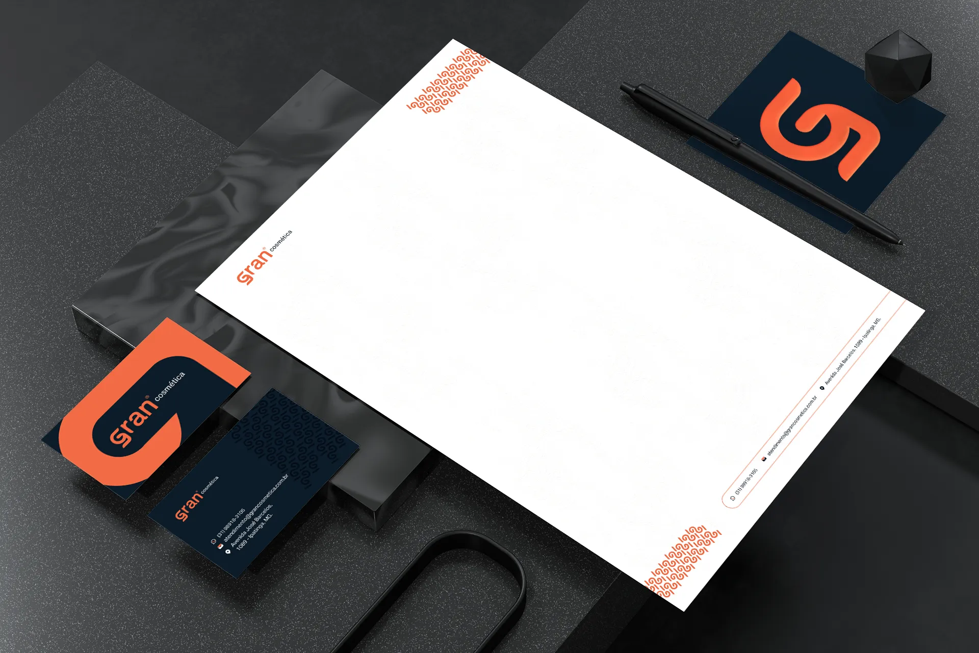 A identidade foi desdobrada em um sistema visual completo e coeso. As embalagens da linha Pro Minox Hair Care utilizam o jogo entre laranja e cinza escuro com o pattern do símbolo "G" como textura de fundo, criando unidade e reconhecimento imediato na gôndola. O mesmo princípio foi aplicado à papelaria corporativa, aos materiais de ponto de venda e à presença digital. No Instagram, o feed foi planejado com uma grade visual que alterna conteúdos educativos, depoimentos e lançamentos, sempre respeitando a paleta e a linguagem gráfica da marca.